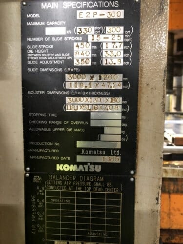 300 Metric Ton Komatsu Press For Sale 2 Available https://affordable-machinery.com/300-metric-ton-komatsu-press-for-sale-2-available/ Tue, 05 Mar 2019 14:58:30 +0000 https://affordable-machinery.com/?p=16061 300 Metric Ton Komatsu Press For Sale 2 Available Model: E2P-300 Year: 1985 Capacity 330 Short Ton – 300 Ton Speed: 15 – 25 SPM Stroke: 450mm 17.7″ Die Height Between Bolster and Slide Stroke Adj. Up: 840mm 33.0″ Slide … Continue reading